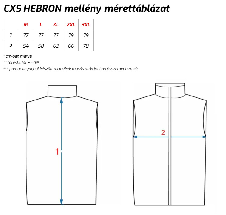 CXS Férfi softshell mellény mérettáblázat.
